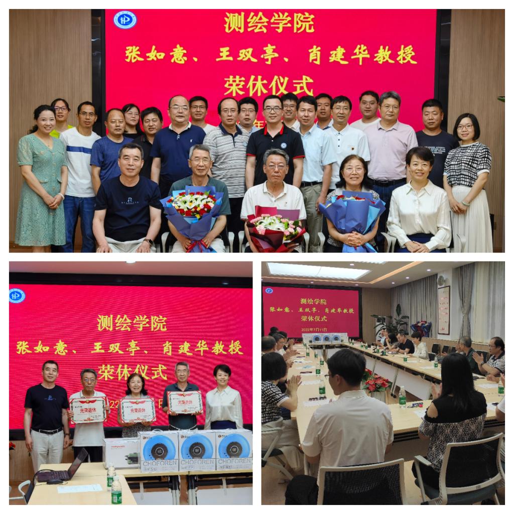 7月11日下午,测绘学院在二楼会议室举行教师荣休仪式,三位退休教师张如意、王双亭、肖建华和学院领导班子成员、部分教工代表参加仪式。仪式由院党委书记茹艳主持。