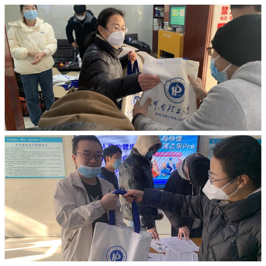 研路相伴,温情护航。2023年硕士研究生招生考试在即,为鼓励考研学子坚定信念、放松心态、勇攀高峰,12月7日上午,测绘学院党委书记张红霞、毕业班辅导员胡佰林为400余名考研学子发放“考研加油包”,送去不一样的冬日暖阳。