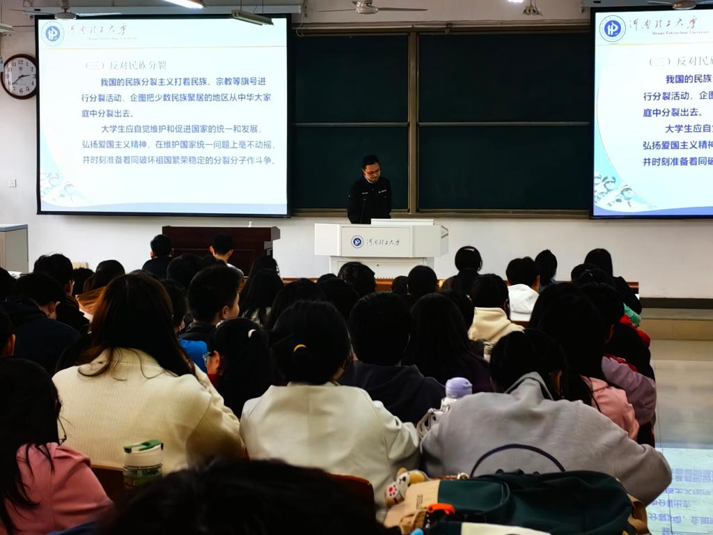会上,赵海江首先向新生介绍了当前电信诈骗的形势,结合高发于学生群体的网络兼职刷单、“校园贷”等具体案例,教育同学们如何防范电信诈骗,保护自身财产安全。同时,要求新生要坚持实事求是的科学精神,坚持马克思主义宗教观,防范和抵制校园宗教渗透。之后,他分别就正确处理人际关系和感情纠纷、维护高校意识形态安全等内容做专题报告。他告诫同学们,作为当代大学生,不仅要用科学知识武装自己的头脑,不贪图蝇头小利,还要有个人安全意识和安全防范能力。