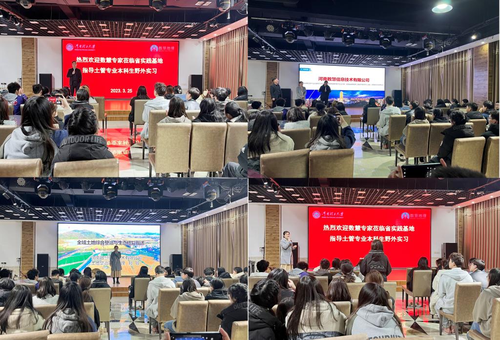实习期间,特邀请省校外实践基地合作单位河南数慧信息技术有限公司新乡分公司的杜习岩经理和孙敏项目经理全程参与对学生野外实习的指导。在实习间隙,杜习岩经理围绕“数慧地理、行业应用、服务能力、企业文化”等四大模块详细介绍了公司的基本情况,促进了学生对数慧公司的了解;孙敏经理以“全域土地整治与生态修复概述”为题,从整治项目概述、资料收集、内业分析、项目调研、经典案例等六大方面为学生们进行了生动、详细地介绍,加深了学生对全域土地综合整治的理解,丰富了本次实习的内容。