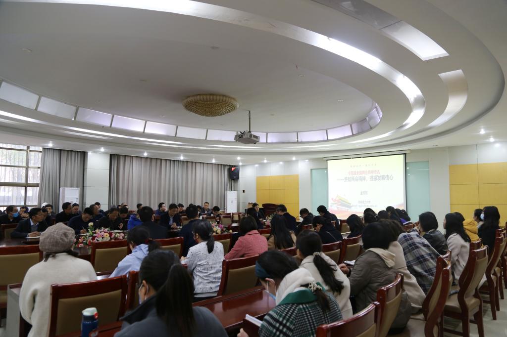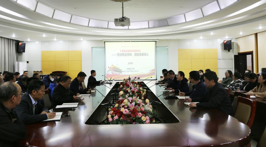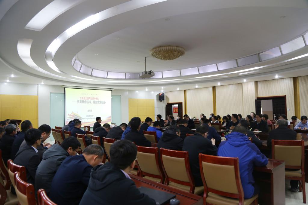 金双根以《贯彻两会精神,提振发展信心》为题,从两会概况、习近平总书记重要讲话精神、政府人大两高报告、机构改革和履职尽责等方面,传达两会精神,分享两会感受。他强调,全体教职工要切实把思想和行动统一到全国两会精神上来,坚守立德树人初心,担当教书育人使命,围绕国家发展战略和地方经济社会发展需要,自立自强、科技创新,为学校双一流创建做出贡献。