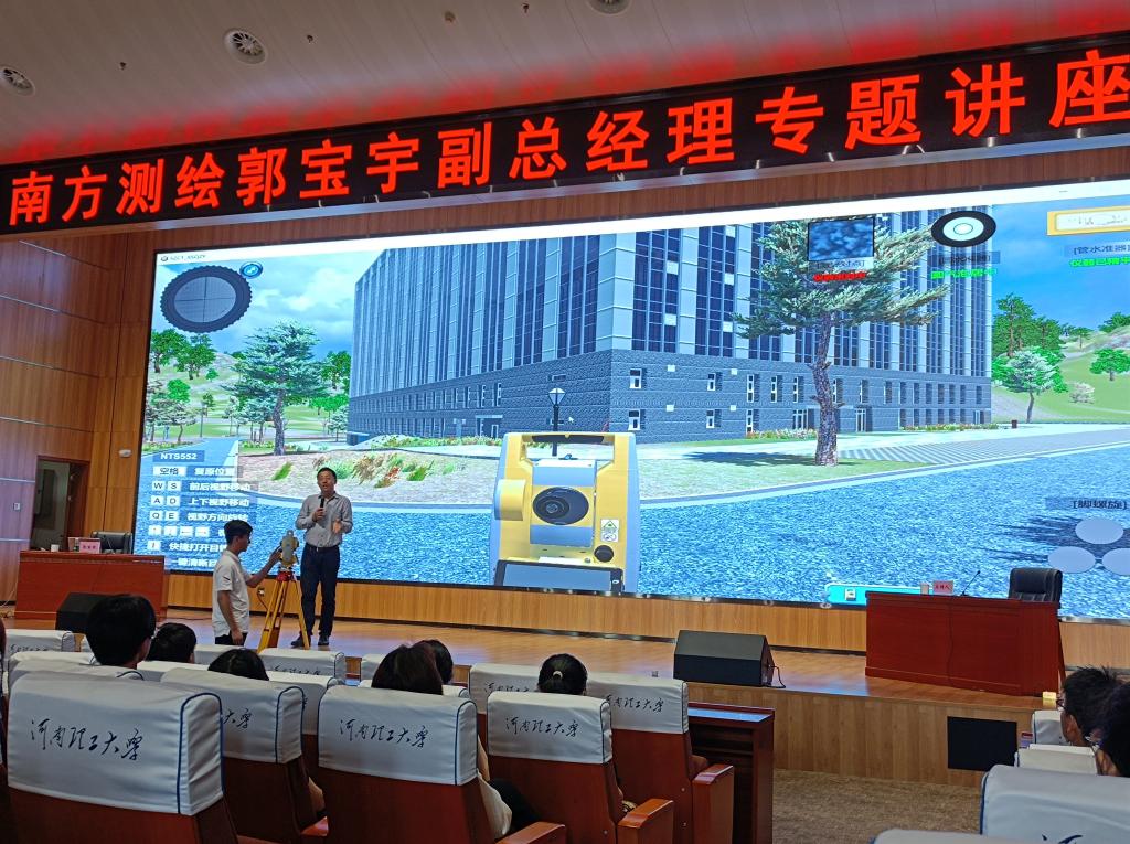 会上,郭宝宇以5G时代测绘技术的广泛应用为切入点,通过学科发展和行业分析、企业对高素质人才的需求、校企双主体育人模式、大学生学科创新创业、测绘教育未来发展趋势进行讲解。郭宝宇重点介绍了“以实代虚”,“以虚促实”,“虚实结合”的虚拟仿真教学理念,现场展示了使用真实全站仪控制虚拟界面、利用遥控器操控虚拟无人机进行数据空间场景测绘的“实操虚测”技术。他指出当今时代正是信息化测绘时代到智能化测绘时代的关键连接点,广大测绘学子应当立足国家经济社会发展需求,全面提升自身能力素养,为推动智能测绘事业发展贡献自己的力量。在交流解惑环节,郭宝宇结合现阶段行业状况和自身经验就同学们的问题进行了深入解答,现场氛围积极融洽,在场人员纷纷表示受益匪浅。