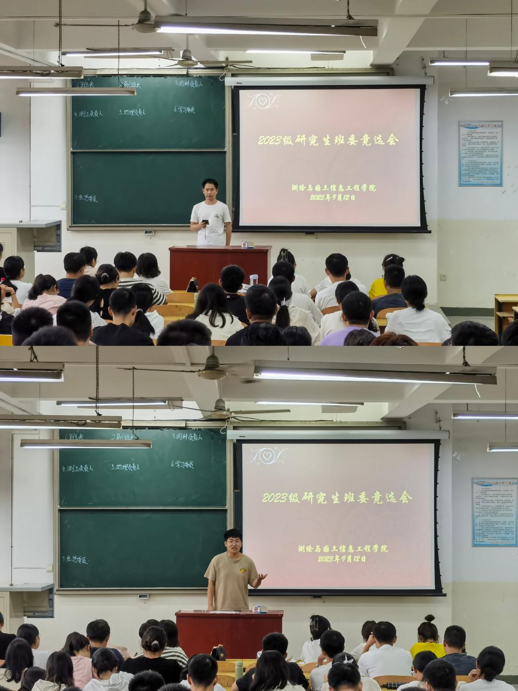 测绘学院于9月12日下午举行了2023级研究生班委竞选大会。2023级全体研究生参加会议,研管办主任谢玉娟,辅导员老师范梦瑶、杨永菊参加会议并担任评委。研究生辅导员范梦瑶主持会议。