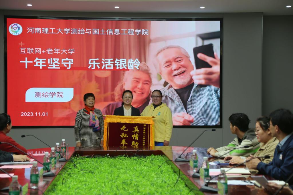 11月1日,解放区老年大学为测绘学院赠送一面绣着“真情助学弘美德,无私奉献映丹青”的锦旗,以感谢测绘学院青年志愿者在过去十年里对“乐活银龄,夕阳无忧”志愿服务项目所做的贡献。解放区老年大学校长张巧红为测绘学院授旗,测绘学院党委书记张红霞、副书记郭学鹏参加仪式并代表学院接旗。参加仪式的还有老年大学学员代表及测绘学院志愿者代表。