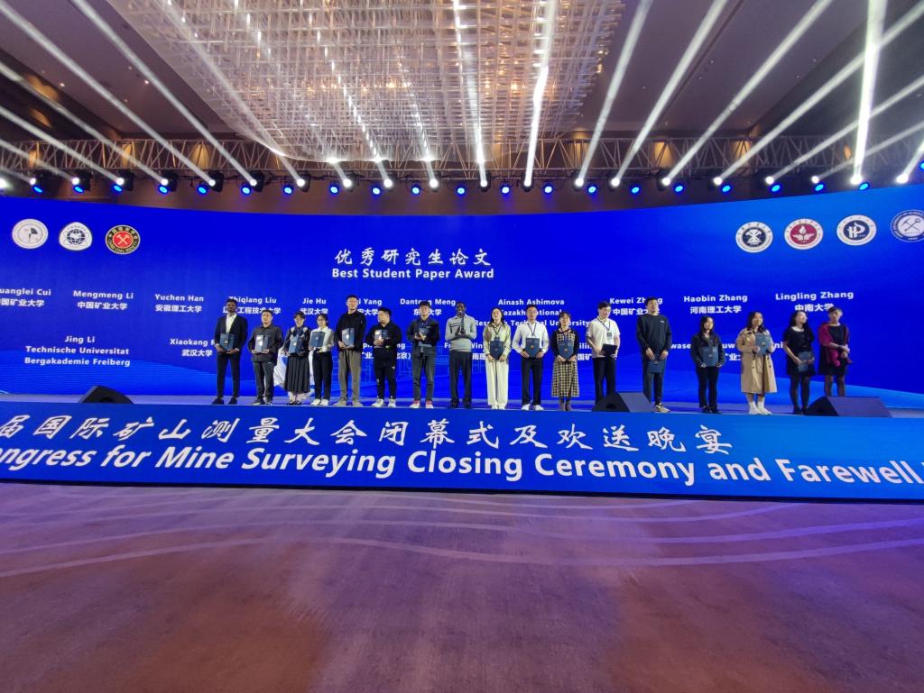 闭幕式上,国际矿山测量协会颁发1位终生成就奖、1位杰出贡献奖、9位青年科学家奖,遴选出12个最佳口头报告、9个最佳PICO、19个最佳研究生论文等奖项。我校测绘学院蔡来良教师获最佳口头报告,测绘学院研究生彭金艳获最佳PICO,测绘学院研究生张浩斌和留学生Frank获最佳研究生论文。