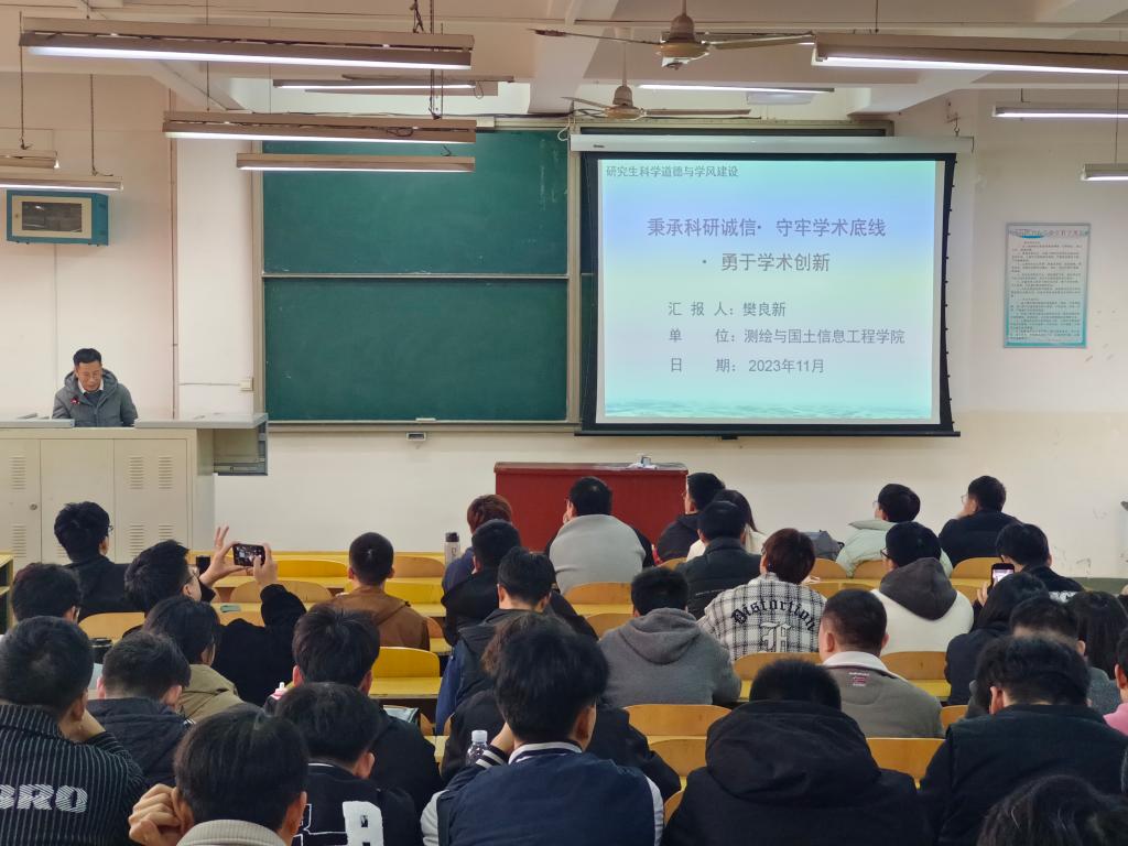 11月21日下午,测绘学院在院楼301举办了《秉承科研诚信,守牢学术底线,勇于学术创新》研究生科学道德与学风建设讲座,特邀请樊良新教授担任讲座嘉宾。讲座由测绘学院辅导员范梦瑶主持,23级全体研究生参加。