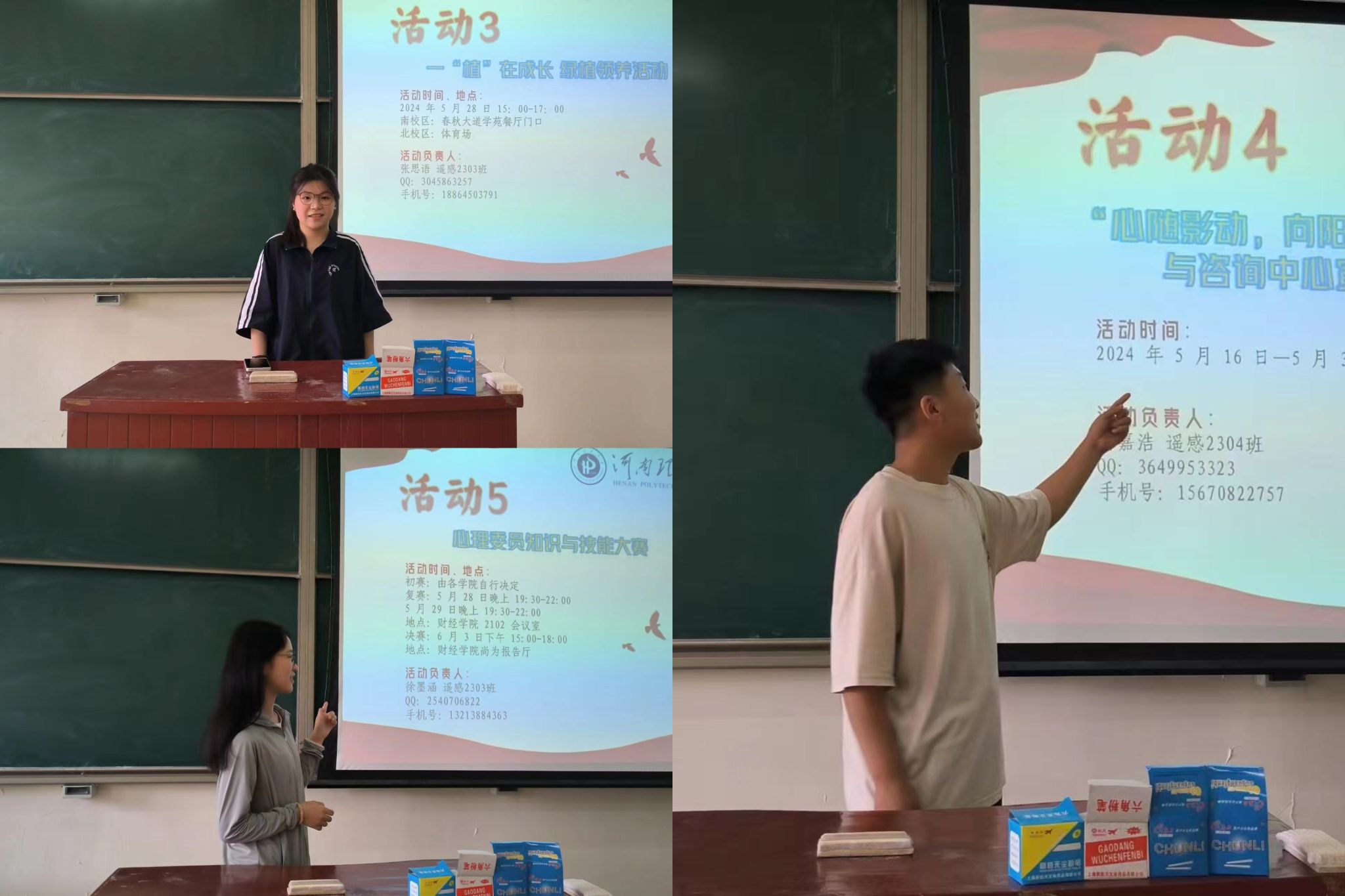 大会伊始,学院心理辅导员邬艳君老师首先对本届大学生心理健康文化节进行了简短的介绍。她强调了心理健康在大学生成长过程中的重要性,同时指出,学院一直秉持以学生为本的教育理念,高度重视学生心理健康教育工作。随后,各项目活动负责人上台发言,他们详细地介绍了学院将开展的“一‘植’在成长”绿植领养活动、“心随影动,向阳而生”心理健康教育与咨询中心宣传微视频大赛、心理委员知识与技能大赛等八项活动,热情洋溢地鼓励同学们要积极参与到各项活动当中。最后,邬老师提醒同学们要关注自我、了解自我、接纳自我,并且要保持健康的生活方式和良好的心态,学会正确面对压力与挑战。
