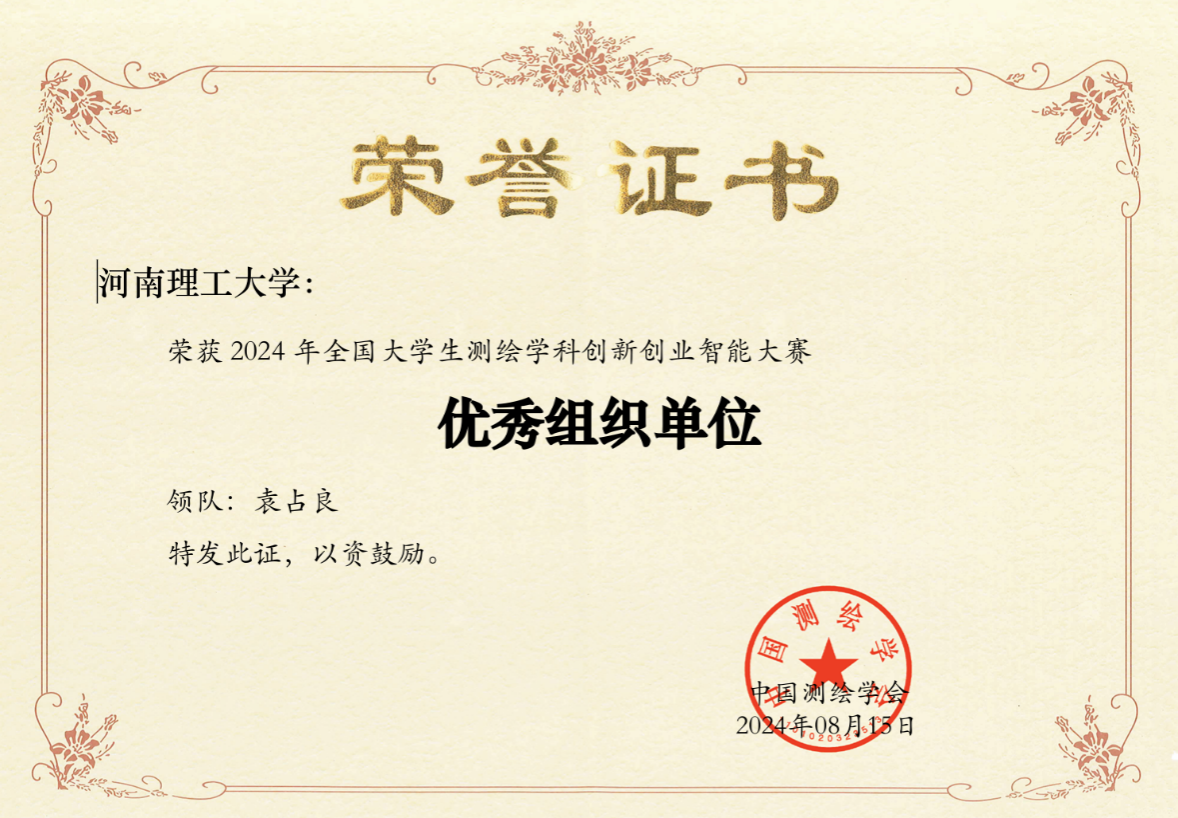 在学院领导的大力支持和指导老师的悉心指导下,由院长袁占良带队,副院长何荣等多名教师参与指导,经过校赛、省赛的层层选拔,最终选出99名同学参加竞赛。在国赛备战期间,采用“一对一、多对一”等指导方法,解决了遇到的各种问题。在指导老师的悉心指导与全体参赛同学的奋力拼搏下,经过激烈角逐,我校学生在本次大赛中荣获优异成绩,共有58人次获奖。无人机航测虚拟仿真代表队陈慧翔荣获特等奖,史泽阳等3名同学荣获一等奖,杨亚晨等2名同学荣获二等奖;数字测图虚拟仿真代表队李青松等3名同学荣获一等奖,王博涵等5名同学荣获二等奖;机载激光雷达虚拟仿真代表队李江源等3名同学荣获一等奖,史采玉等5名同学荣获二等奖;测绘程序设计代表队闫慧敏荣获特等奖,闫文秀等6名同学荣获一等奖,韦泓宇等2名同学荣获二等奖;开发设计竞赛代表队孙启迪等3人荣获特等奖,王自烁等荣获二等奖;科技论文代表队张宏宇等荣获特等奖,章乐聪等3人荣获二等奖。程钢、陈志超、杜宗亮等6人获优秀指导教师称号,我校荣获优秀组织奖。
