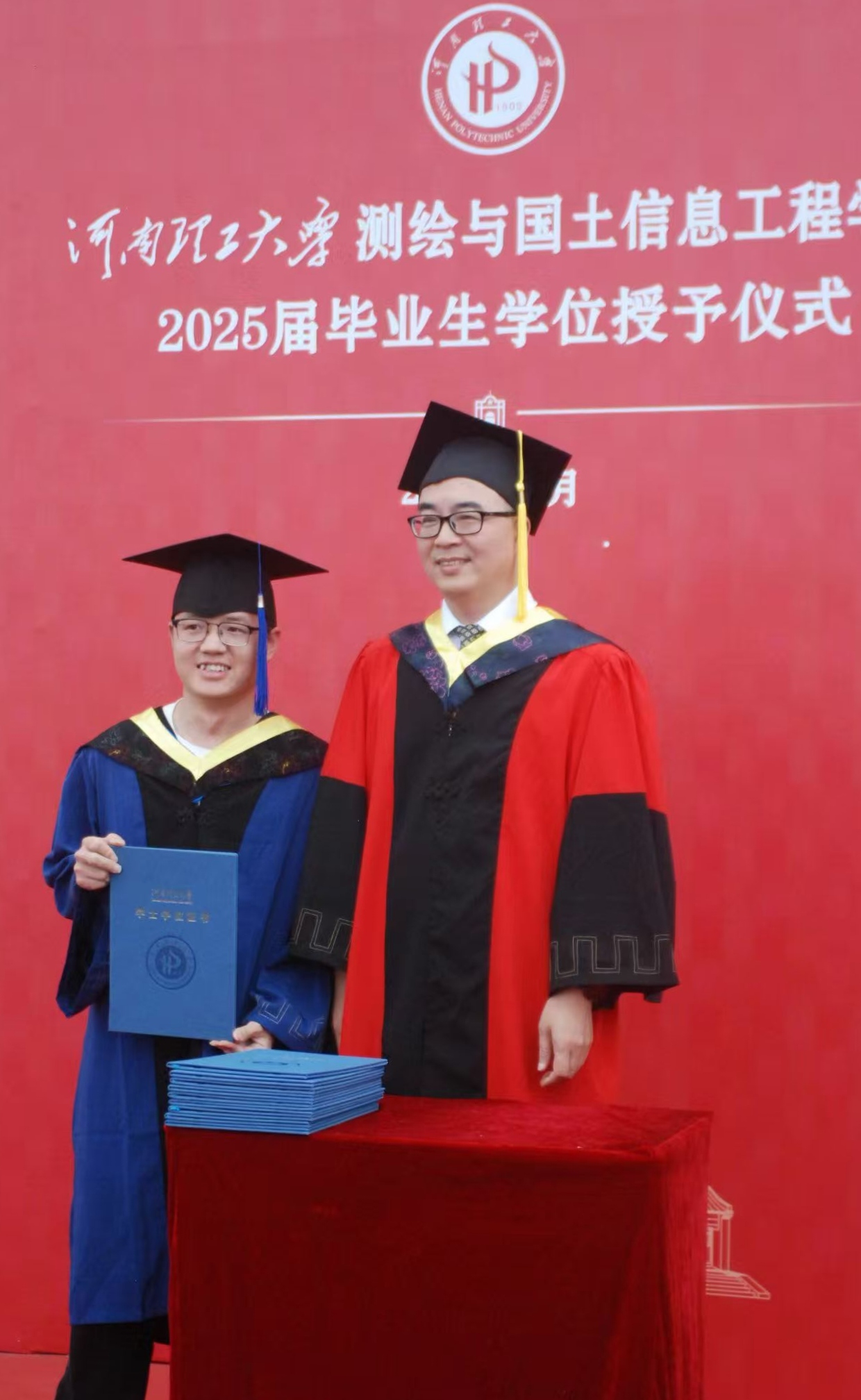 仪式现场,学院领导身着绛红导师袍,分别为每一位毕业生拨穗正冠、颁发学位证书并合影留念。当流苏划过帽檐,导师们目光中的期许与毕业生们挺拔的身姿交相辉映,镜头下定格一张张荣光绽放的笑颜。各位导师以行动书写育人初心,为测绘学子扶正学位帽,用目光传递祝福,毕业生深深鞠躬回应师恩,会场弥漫着收获的温情与离别的眷恋。