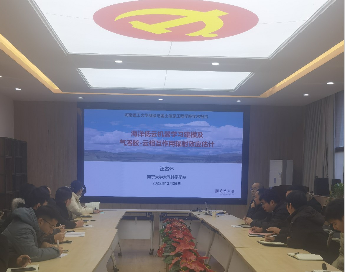 1226日上午,南京大学汪名怀教授受邀到测绘学院进行学术交流,并在学院二楼会议室作“基海洋低云机器学习建模及气溶胶-云相互作用辐射效应估计”学术讲座。会议由学院副院长闫伟涛主持,遥感科学与技术系教师傅建春、都伟冰、杨磊库、蔡太义、李毅夫等及部分研究生参会。