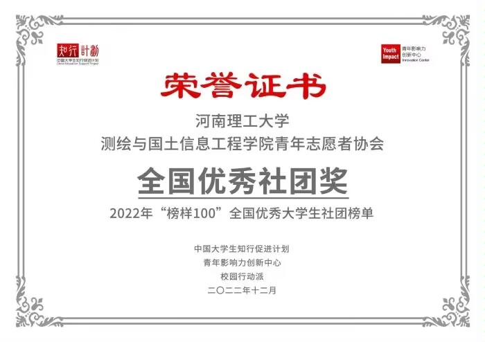 近日,2022年“榜样100”全国优秀大学生社团榜单发布,河南理工大学测绘与国土信息工程学院青年志愿者协会上榜。