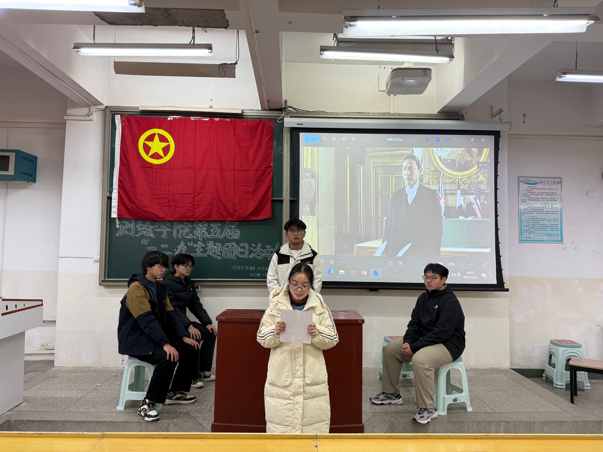 为铭记“一二·九”爱国运动光辉历史,传承红色基因,激发同学们的爱国热情与时代责任感,12月6日下午,测绘学院团委在院楼301教室组织开展第五届“一二·九”主题团日活动。学生会主席杨昊、青协会长张为淘、青年宣传中心主任孔子毅、团委学生副书记侯亦菲、团委学生副书记乔斯琪以及团委综合办公室各部门部长作为此次比赛评委,比赛由团委秘书处何世杰主持。