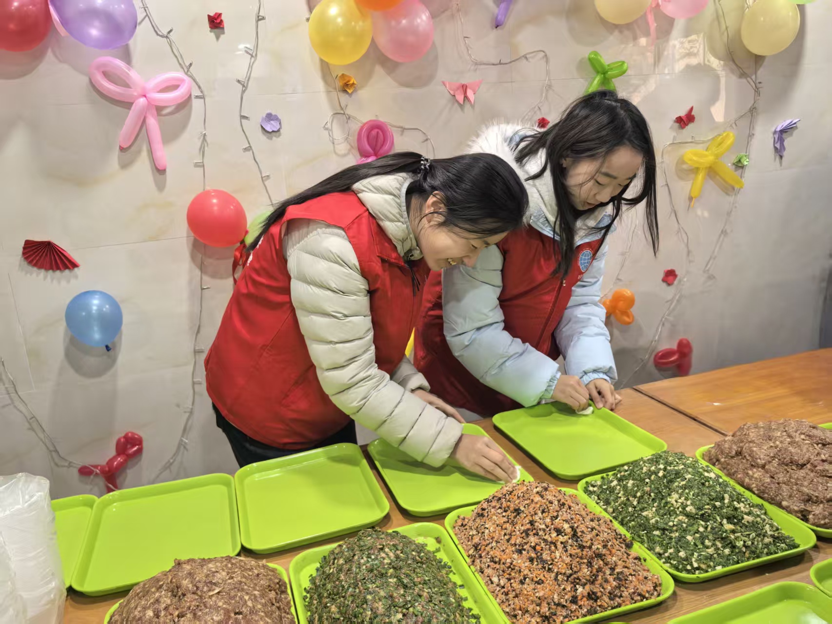 活动前,志愿者提前准备好食材,并用装饰物将现场布置得温馨舒适。活动当天,同学们积极参与,大家分工明确、默契配合,一个个饱满的饺子在大家手中成型,承载着对考研学子的美好祝愿。在活动过程中,梅三宿舍楼里的欢声笑语此起彼伏,更添一抹温暖。每位参与活动的同学都吃到了热气腾腾的饺子,品尝到了这份冬至限定的温暖,驱散了疲惫,增添了动力。