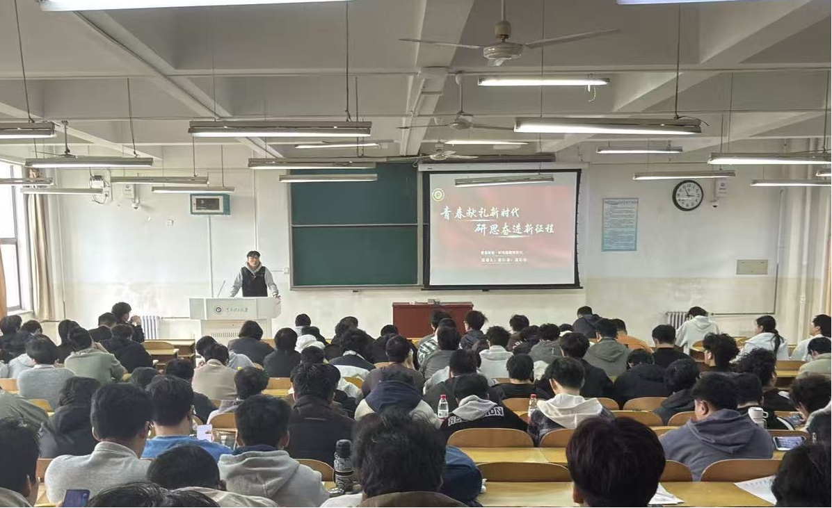在宣讲中,张时磊指出,勤学苦读、求是创新是青年成长的根基,知行合一、躬身实践是成才的必经之路。作为测绘专业学子,更要立足专业特色,将理论学习与野外勘测、技术应用相结合,把专业知识学深悟透,以真才实学服务国家发展。他强调,学生工作是最好的实践课堂,要在服务同学、助力集体中练就实干本领,形成“学习—实践—成长”的提升闭环。谈及青春担当,张时磊深情讲述了自己作为河南理工大学第 26 届研究生支教团成员,赴大理南涧县支教的难忘经历。用耐心与坚守传递温暖,以实际行动践行 “到西部去、到基层去、到祖国最需要的地方去” 的青春誓言。