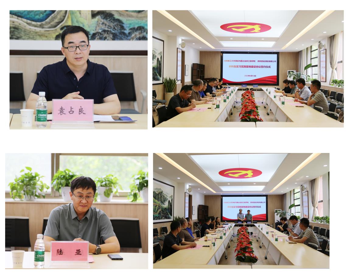 为进一步加强教学实习基地建设、提高学生专业技术实践能力,持续深化产教协同合力,6月13日下午,河南百启测绘有限公司总经理陆亚、副总经理王炎昌等一行4人莅临学院,与测绘学院签订本科生实习实践基地建设协议。签约仪式在测绘学院二楼会议室举行,院长袁占良、副院长程钢、各系(室)主任参加会议,会议由副院长程钢主持。
