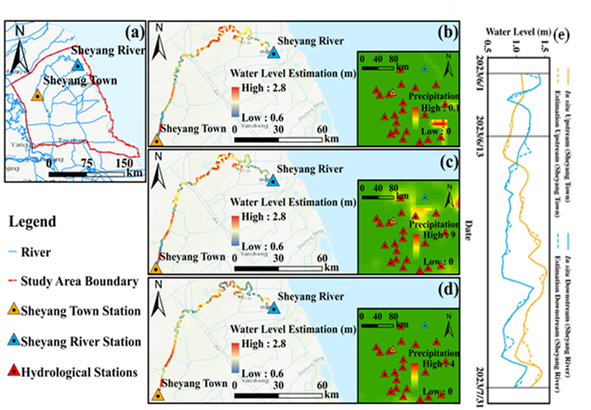 图1. 射阳河水位估算与里下河地区降水分布:(a) 上下游水文站点位置分布图;(b-d) 6月1日、6月13日及7月31日连续水位空间分布预测结果;(e) 上下游水位估计值与实测数据时序对比