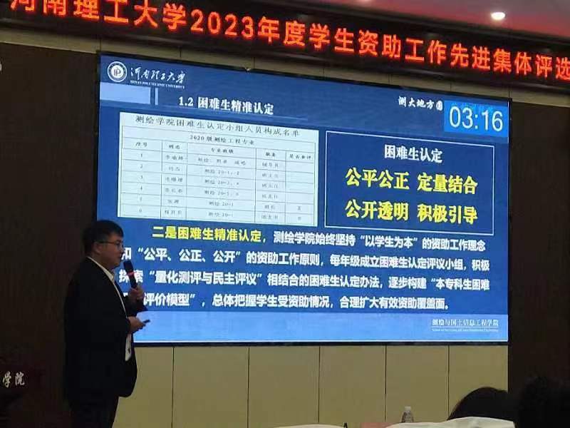 在河南理工大学2023年度学生资助工作先进集体评比中,经过资助考核认定,线下ppt汇报展示,评委评比打分等环节,最终我院喜获“2023年度学生资助工作先进集体”荣誉称号,我院辅导员马树俊老师获资助先进个人。