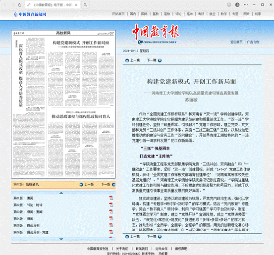 10月17日,《中国教育报》以《构建党建新模式 开创工作新局面》为题,聚焦党的建设、人才培养、学科发展、社会服务等工作,全面展示测绘学院近年来高质量党建引领高质量发展的丰富成果,具体内容如下: