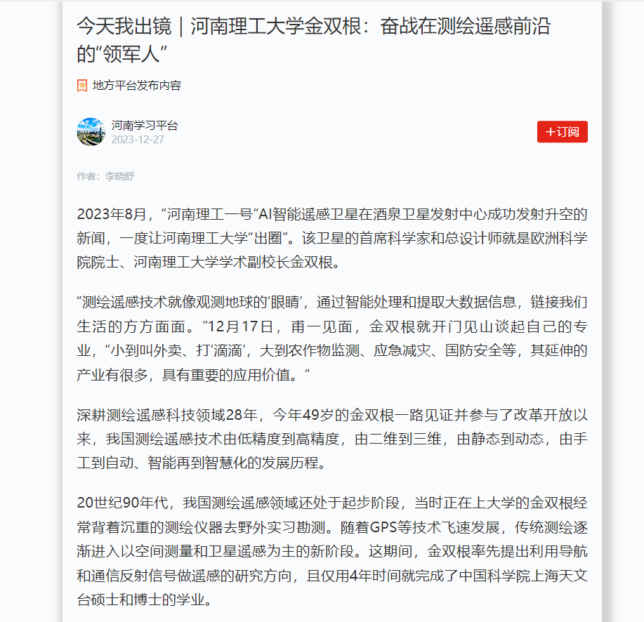 深耕测绘遥感科学和技术领域29年的金双根,一路见证并参与了我国测绘遥感技术由低精度到高精度的发展历程,获得多项创新性科研成果。2023年8月,金双根作为首席科学家和总设计师带领团队实现了“河南理工一号”AI智能遥感卫星成功发射升空,助力煤矿和生态环境实现实时智能监测。