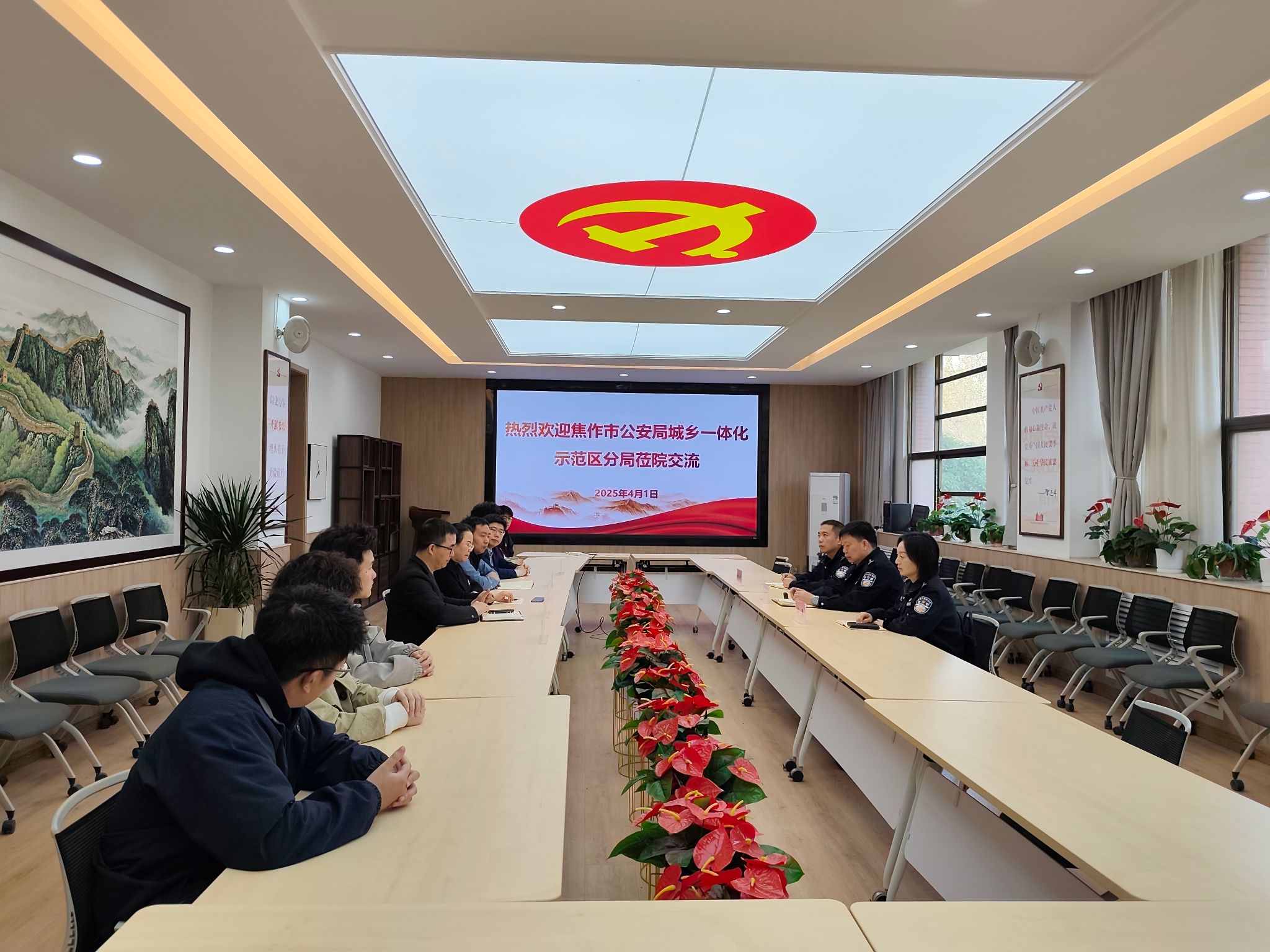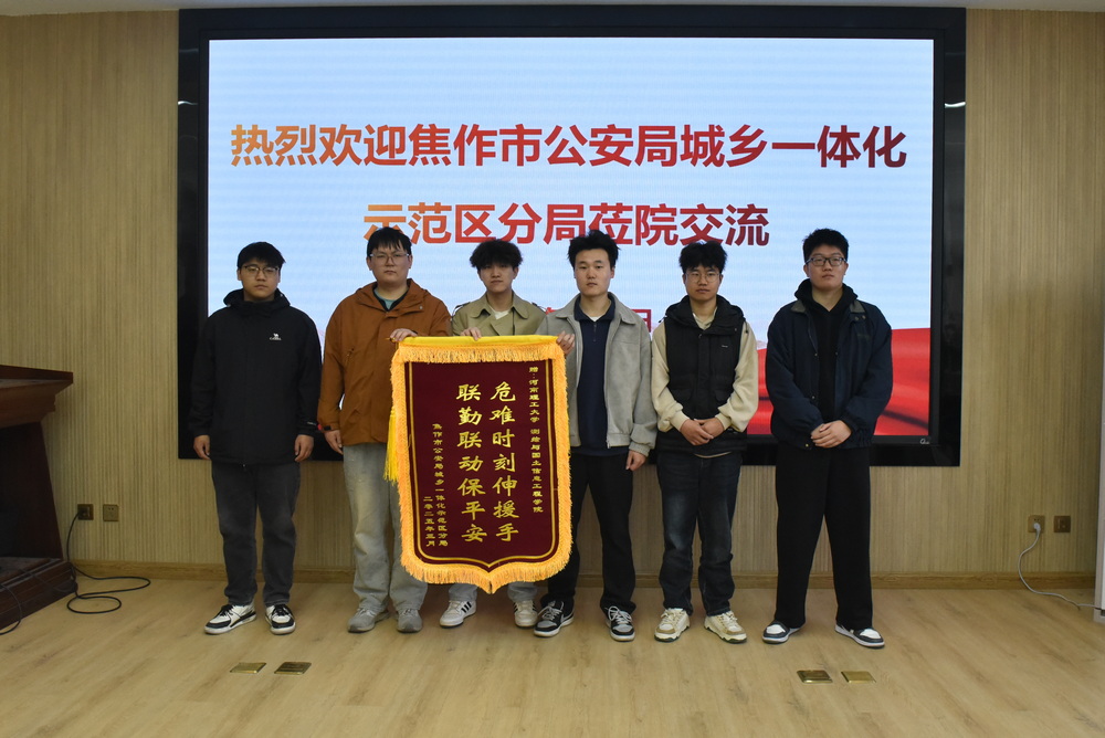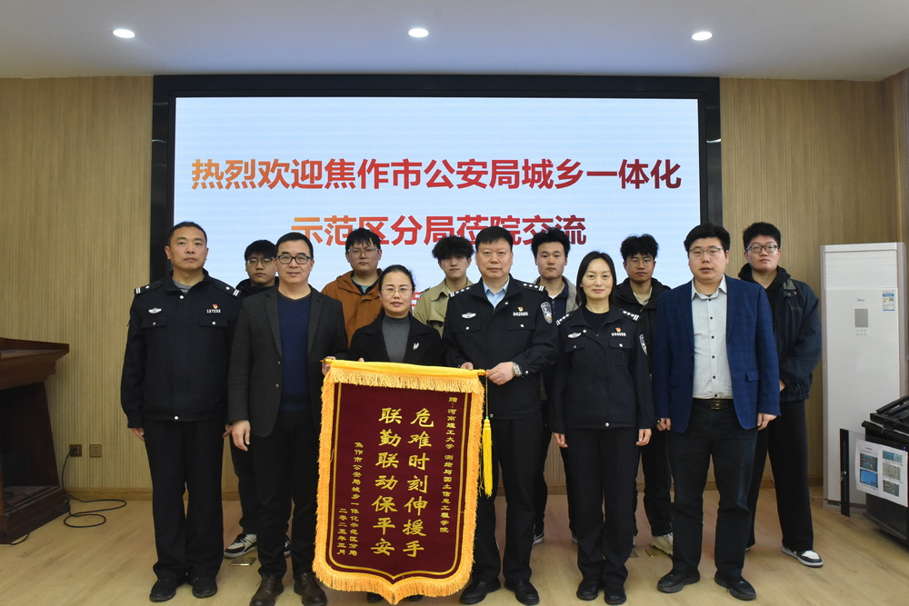 2025年4月1日上午,焦作市公安局高新分局政委郭景川、副局长李曼、纪委书记苗瑞轩一行专程来到测绘学院,代表分局向学院赠送“危难时刻伸援手,联勤联动保平安”的锦旗,以感谢测绘学院在北山灭火救援中的突出贡献。测绘学院班子成员、参加救援的师生代表参加仪式并接受锦旗。