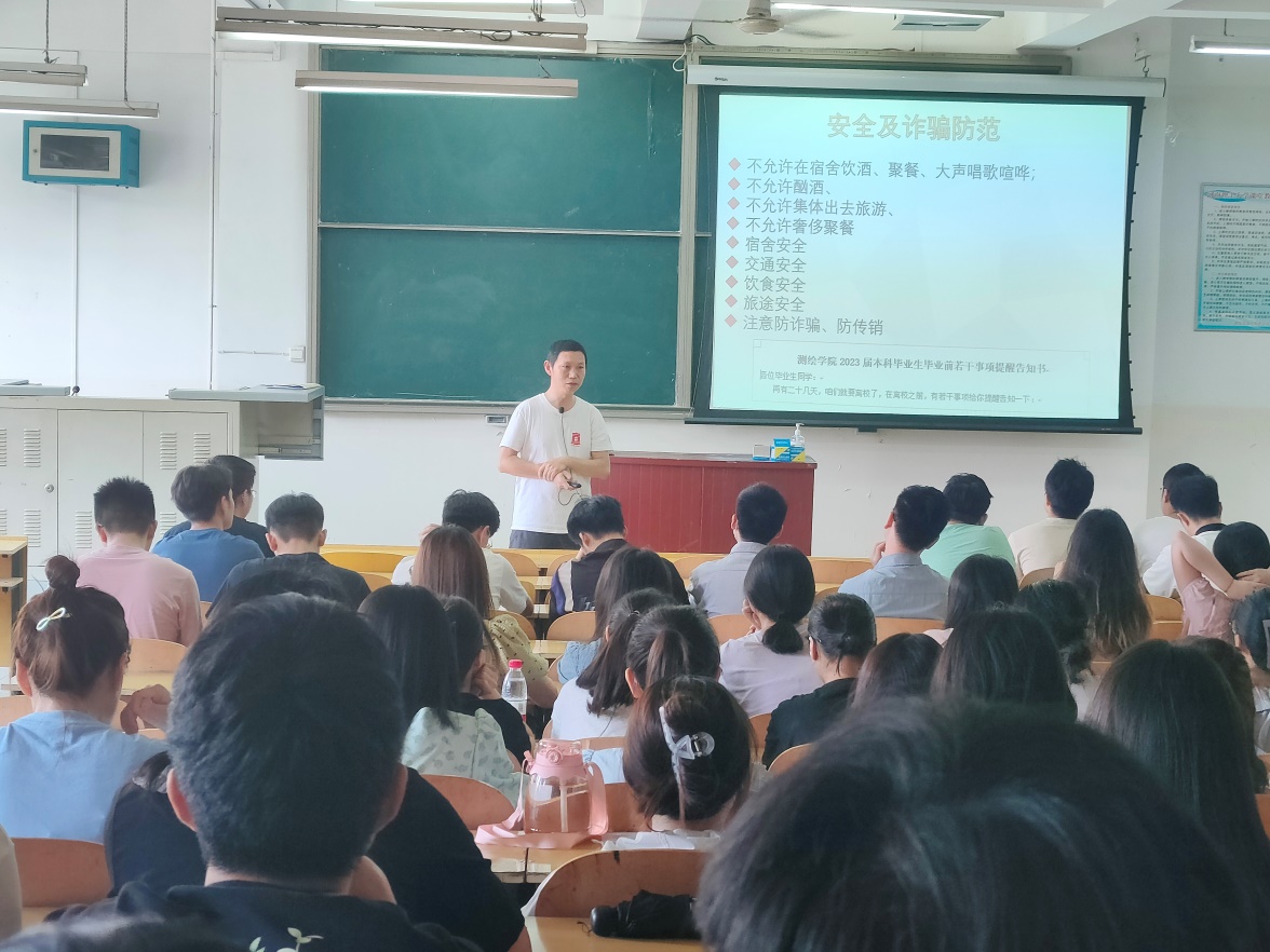 主题教育围绕安全教育、暖心毕业两方面展开。会上,胡佰林强调了校园安全稳定的重要性,为保证毕业生安全顺利离校提出了一系列要求和建议,包括班委寝室楼值班、实行网格化管理、进行点对点关怀等。胡佰林指出,全体毕业生要严格遵守校规校纪,杜绝夜不归宿现象;切忌聚众酗酒、打架斗殴;拒绝不良网贷、网络赌博、警惕网络诈骗;理性处理各类矛盾,遇到问题积极寻求老师帮助。杨笑冰呼吁全体学生党员干部承担自身职责、关心班级同学,发挥个人主动性,站好毕业前最后一班岗;同时,她希望全体毕业生常怀感恩之心,铭记母校培养之情,继续发扬明德任责校训,积极践行好学力行校风,努力实现自我价值,早日报效祖国、回馈社会。会议最后,老师们向毕业生送上了毕业祝福,鼓励同学们积极追求自我理想,勇敢迈向人生新征程,并祝愿全体毕业生前程似锦,未来可期。