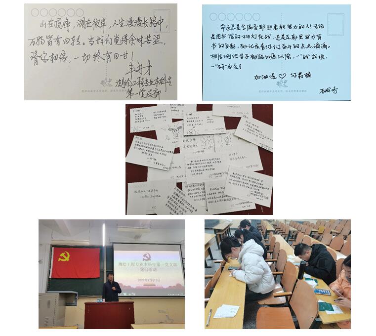 活动中,支部书记丰习才结合自身经历与指导往届学生成功上岸的经验,分别从今年和往年的报考形势、考前最后一周的复习建议、心态调整以及考前安全等方面为学生进行了讲解。丰老师嘱托大家近期一定要查漏补缺,提高复习效率,重点关注自己之前不会的和错过的题目;丰老师用自己的亲身经历讲述调整心态的重要性,告诫大家要稳住心态,全力以赴,相信自己的复习成果,相信大家所具备的能力;同时,丰老师还提醒大家关注身体健康,近期流感盛行,医院人满为患,周围的人纷纷感冒发烧,作为考研人,一定要好好预防,多注意休息,合理安排作息时间,加强自身免疫力。接下来,支部党员齐心协力为测绘20-1、2、3班考研同学在明信片上写上自己的祝福语,测绘学院张红霞书记、20级毕业班辅导员李瑜婷等老师,一起为考研的同学送上祝福。
