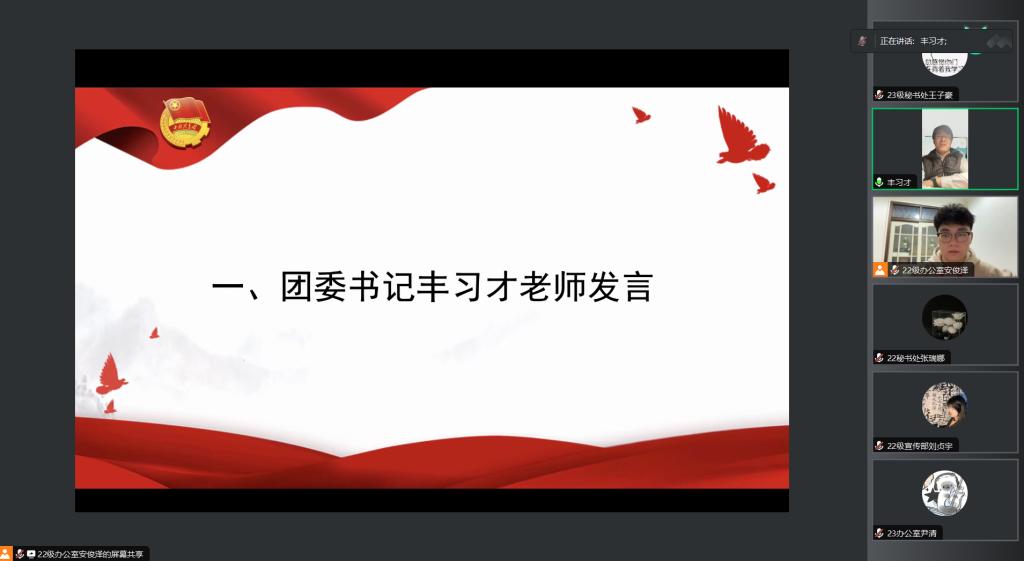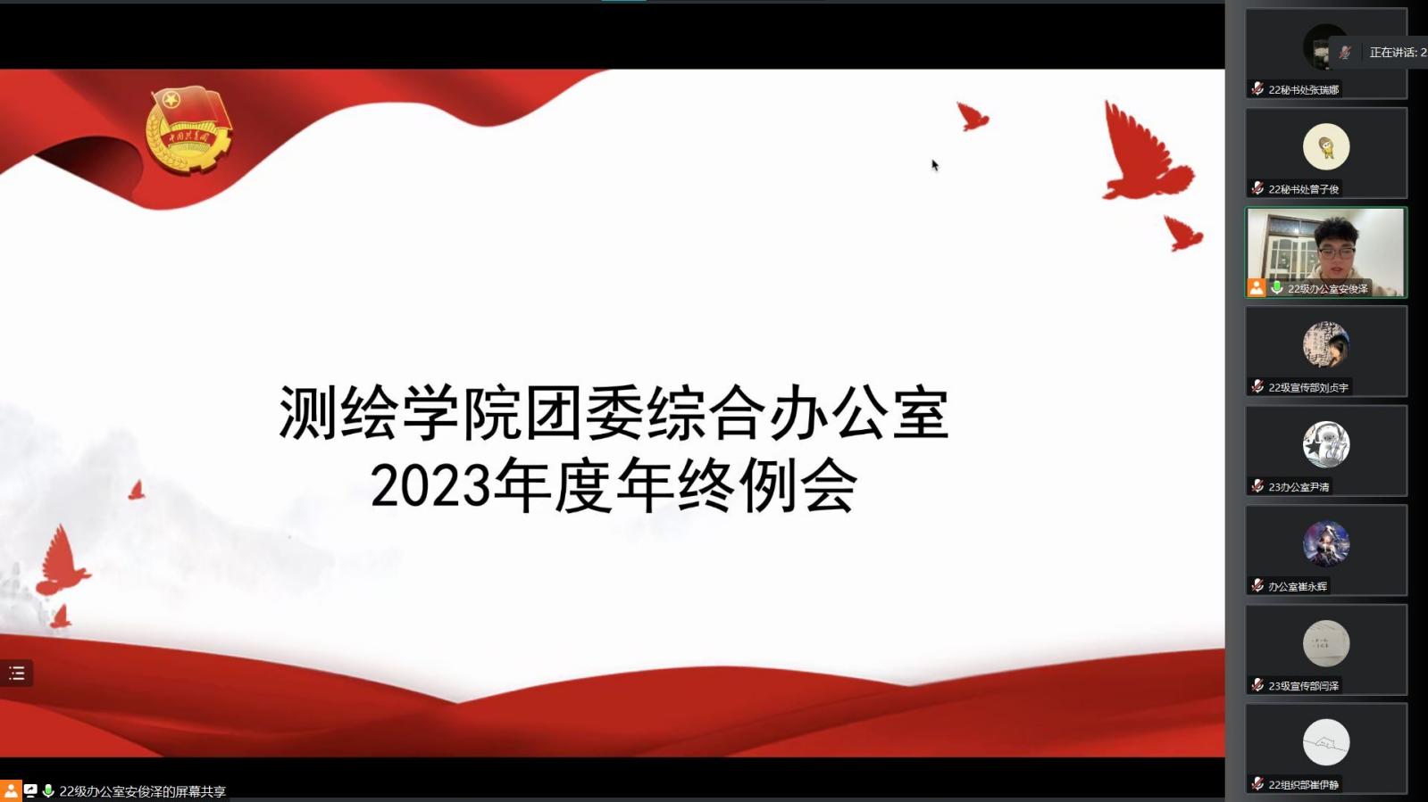 为复盘本年度工作,总结工作经验,合理规划下学年工作进程,测绘学院团委于1月17日晚线上召开测绘学院团委综合办公室2023年度年终例会,院团委书记丰习才老师、测绘学院团委综合办公室全体成员参加,会议由办公室安俊泽主持。