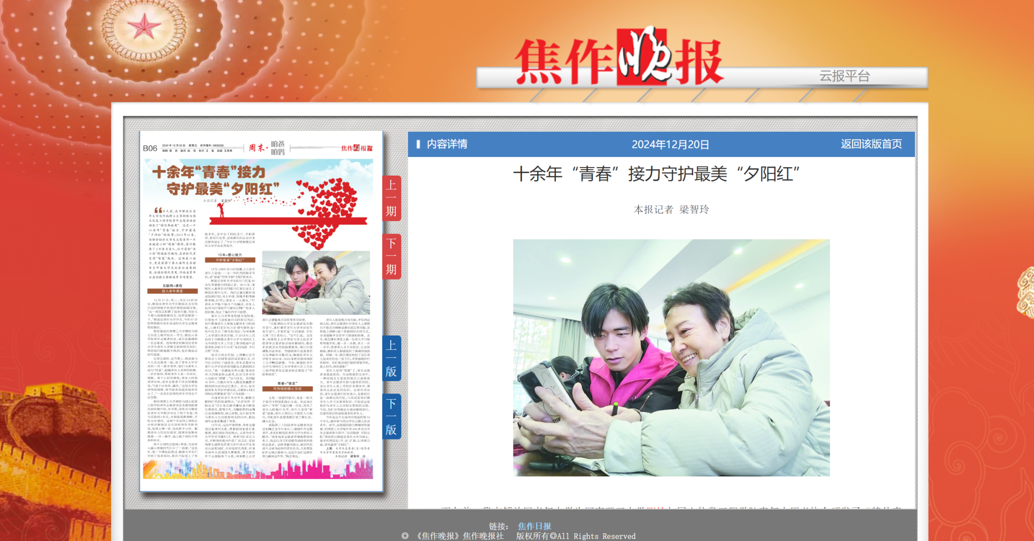 “十余年青春接力,守护最美‘夕阳红’”。自2013年以来,测绘学院青年志愿者协会坚持每周在焦作市老年大学开设手机使用课程,以帮助叔叔阿姨们在这个智能设备快速发展的时代跨越数字鸿沟。2024年12月20日,为赞扬志愿者们赤诚爱心与无私奉献,焦作日报特别报道了测绘学院青年志愿者协会的老年大学志愿服务项目。