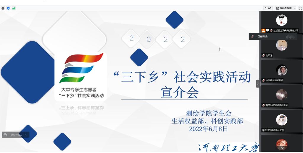 为使同学们更详细地了解暑期“三下乡”社会实践活动的开展过程,充分认识社会实践的重要意义,积极参与社会实践, 6月8日中午,测绘学院举办暑期“三下乡”社会实践活动线上宣介会,此次社会实践活动由院学生会生活权益部主办、科创实践部协助举办。2020级、2021级共计190余名同学参加了会议。