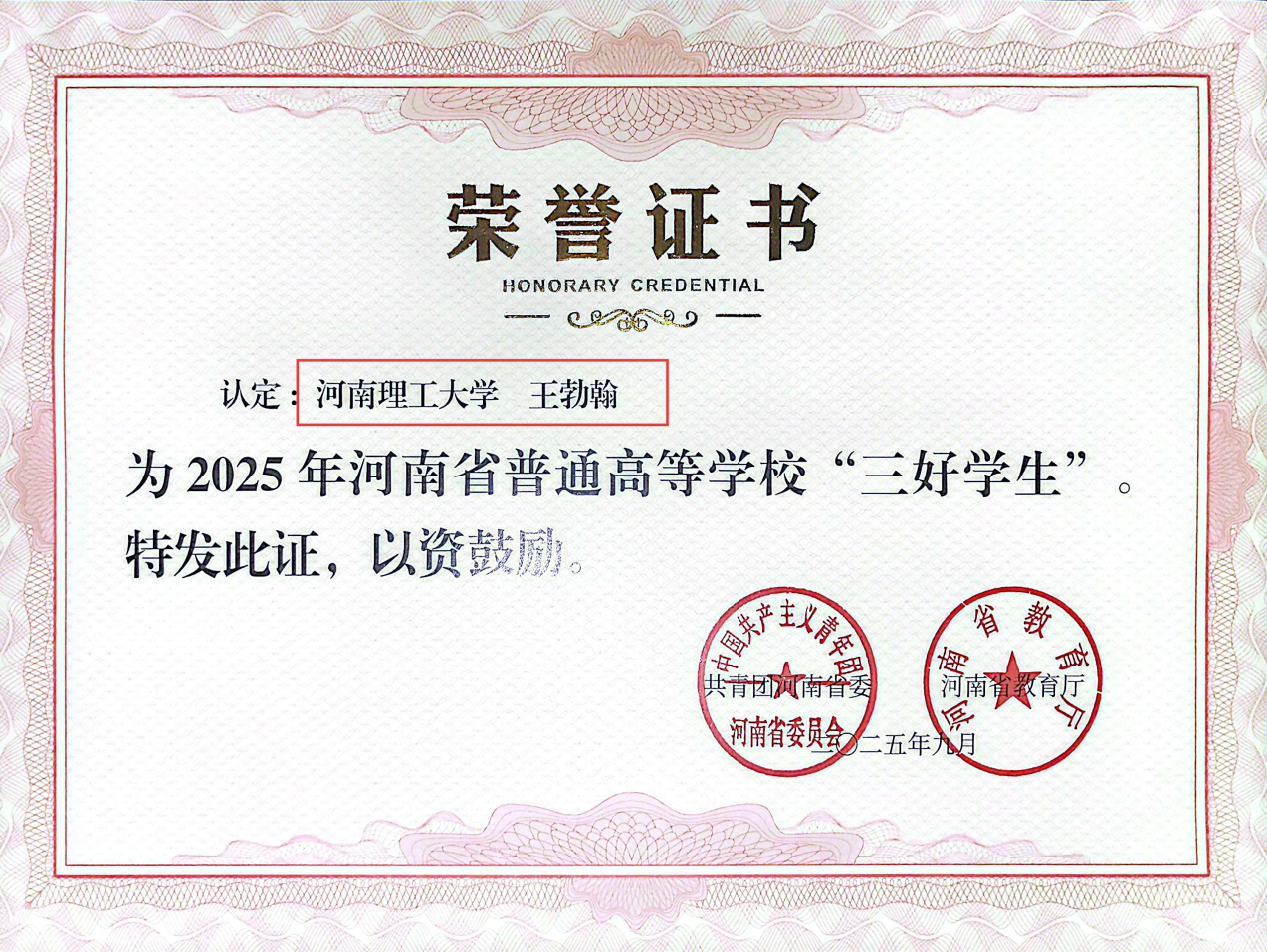 我院测绘工程2204班中共党员王勃翰同学,凭借在校期间的卓越表现,获评2025年度“河南省三好学生”,其成长轨迹成为学院青年奋进的鲜活范本。