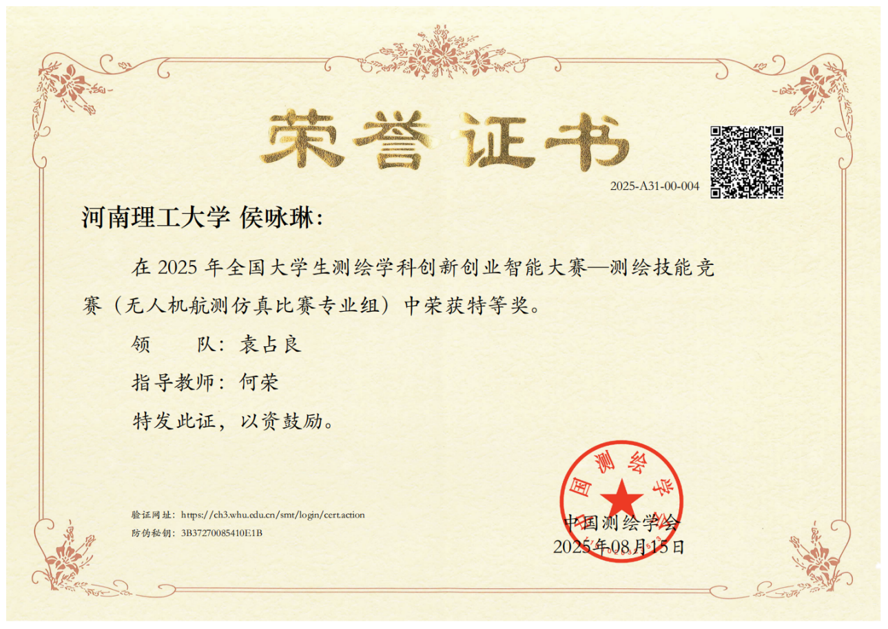 侯咏琳的大学生活始终围绕“扎实”与“突破”展开:学业赛道上,她连续两年斩获国家励志奖学金,获评校级“三好学生”,英语四六级、普通话二级甲等证书全部收入囊中,成绩稳居专业前列,为推免深造筑牢根基;科研领域中,她主动扎根创新实践,不仅自主拿下1项实用新型专利、1项软件著作权,更在全国大学生测绘学科创新创业智能大赛、国际大学生数学建模竞赛等赛事中“突围”,累计收获国家级奖项4项、省级奖项12项、校级奖项30余项,用成果诠释了“专业+创新”的成长路径。在实践赛场,她同样步履不停:身兼学院学生会骨干,她牵头组织各类活动,以细致服务获评“优秀学生会干部”“十佳学生会干部”;同时活跃在志愿服务、辩论、体育等第二课堂,从校园赛场到基层服务,以实际行动践行“小我融入大我”的青年担当。