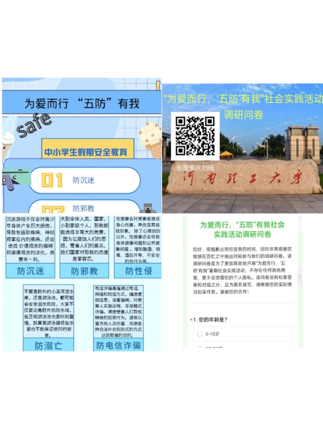 为宣传“防溺亡、防性侵、防沉迷、防邪教以及防电信诈骗”等“五防”知识,提高青少年安全防范意识,6月27日至7月6日,测绘学院“为爱而行,五防有我”暑期三下乡社会实践团6名成员,分别在河南省洛阳市、濮阳市、平顶山市、鹤壁市、辽宁省沈阳市等地开展为期十天的暑期社会实践活动。
